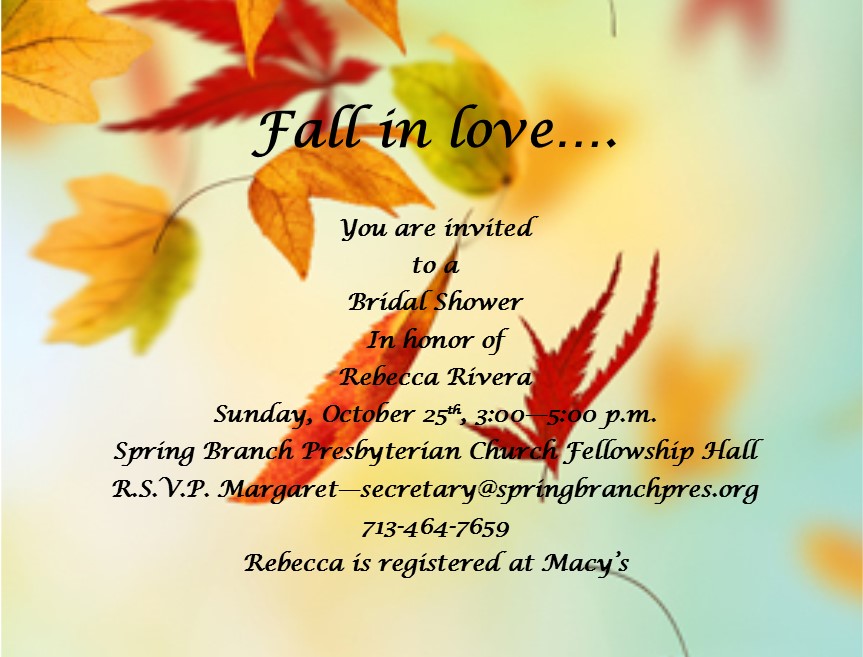Rebecca and Joel are getting married! A wedding shower will be held for Rebeca Rivera on Sunday, October 25th from 3-5pm in the Fellowship Hall. Rebecca is registered at Macy’s.… Read More